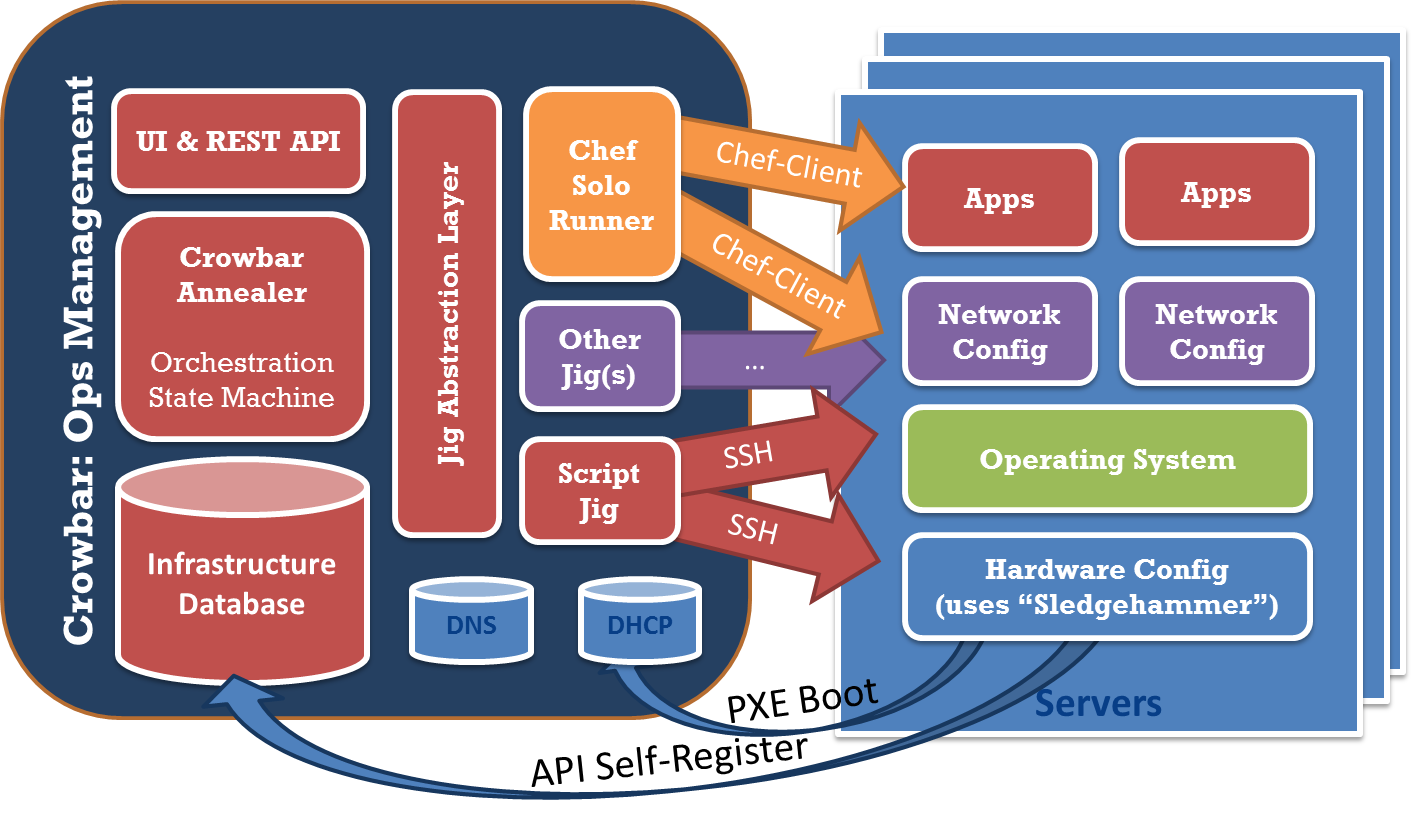 Crowbar started out simply as an installer for the “Dell OpenStack™-Powered Cloud Solution” with the objective of deploying a cloud from unboxed servers to a completely functioning system in under four hours. That meant doing all the BIOS, RAID, Operations services (DNS, NTP, DHCP, etc.), networking, O/S installs and system configuration required creating a complete cloud infrastructure. It was a big job, but one that we’d been piecing together on earlier cloud installation projects. A key part of the project involved collaborating with Opscode Chef Server on the many system configuration tasks. Ultimately, we met and exceeded the target with a complete OpenStack install in less than two hours.